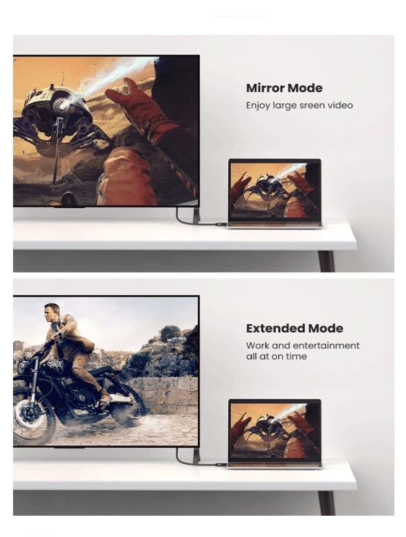 Supports multiple display modes: Mirror display (display to 2 same screens) and Extend screen (display to 2 different screens)