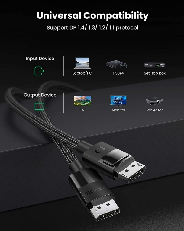 A DisplayPort 1.4 cable that supports 8K 60HZ provides 32.4Gbps of bandwidth for data transfer ideal for a high-end gaming monitor