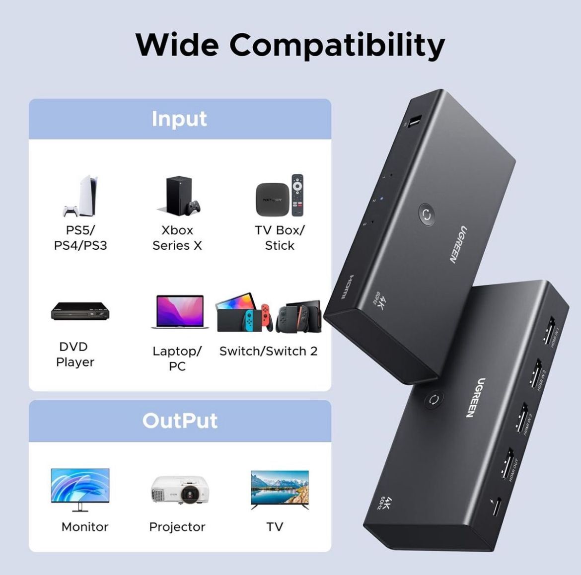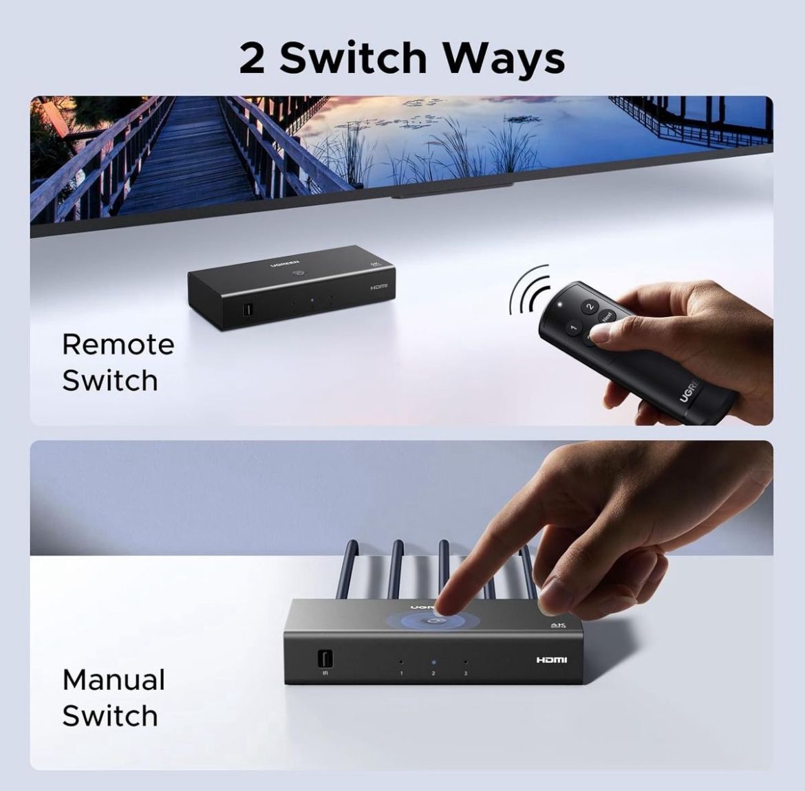 HDMI Switcher 3-In 1-Out: The UGREEN HDMI switcher allows you to easily stream 3 HDMI sources to 1 HDMI display (note: only one display can be used at a time!). This HDMI multi-port adapter frees you from the hassle of plugging and unplugging HDMI cables, protecting your ports and cables, so you can enjoy work or gaming effortlessly.