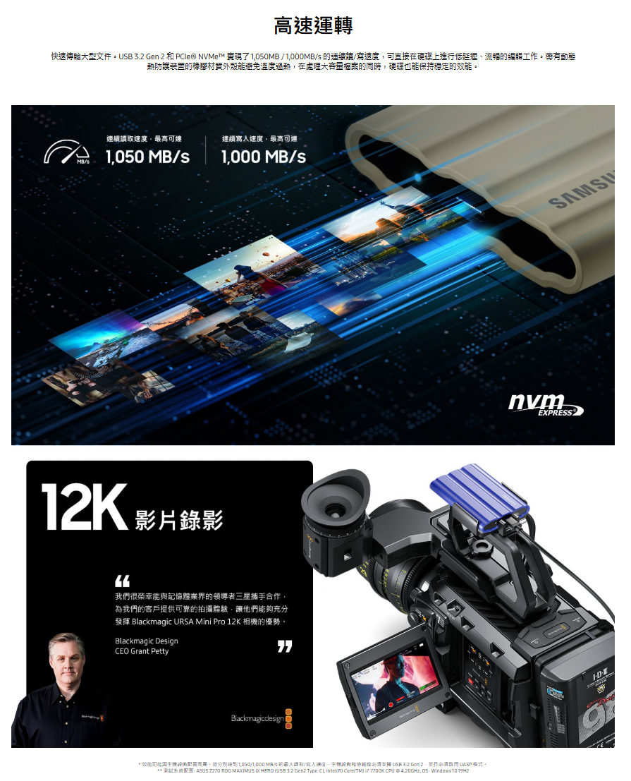 連續讀取速度 : 最高可達 1,050MB/s 連續寫入速度 : 最高可達 1,000 MB/s*