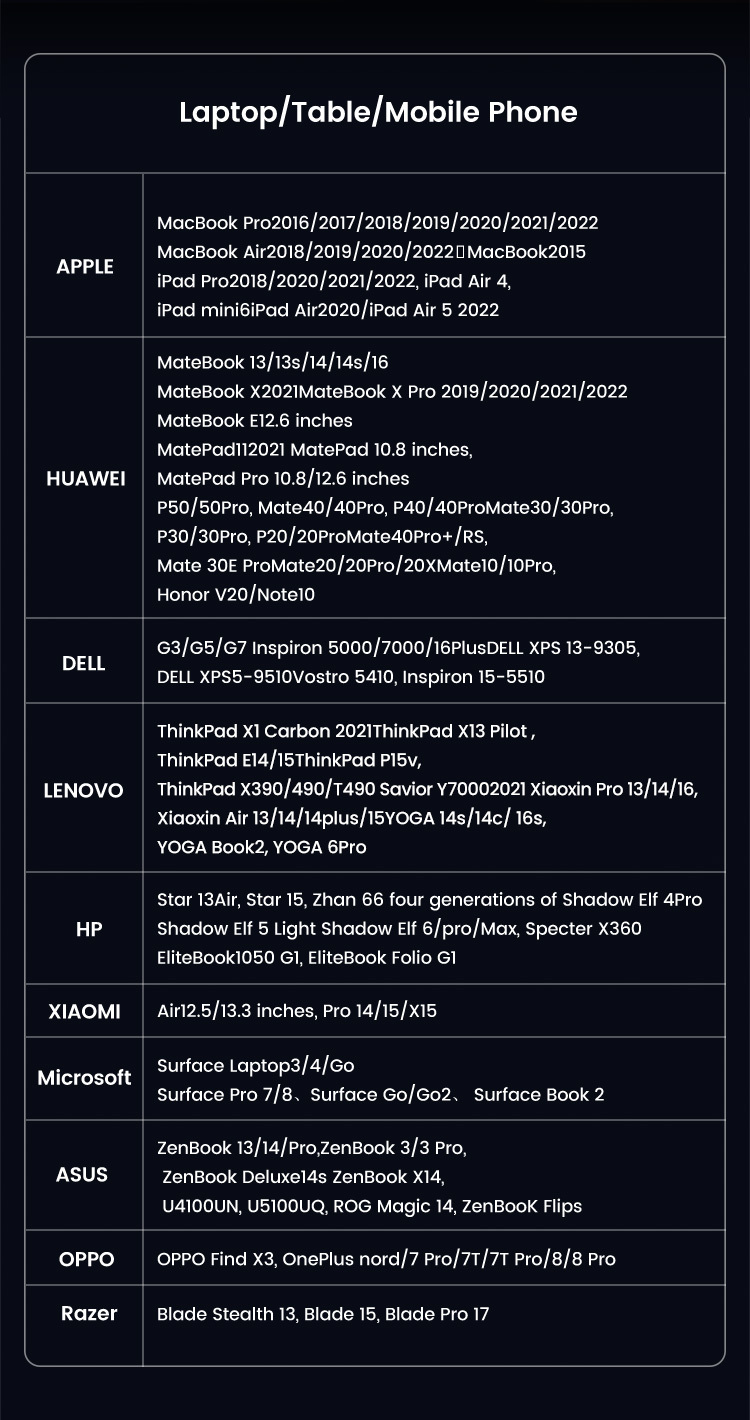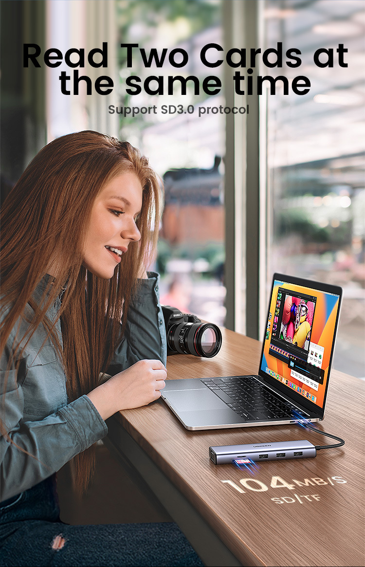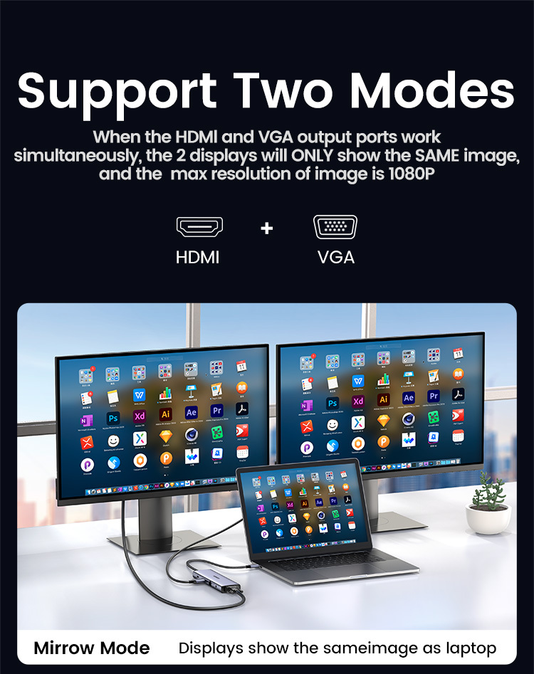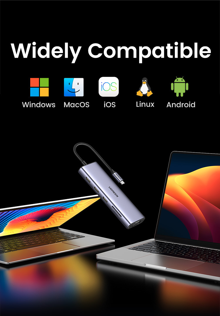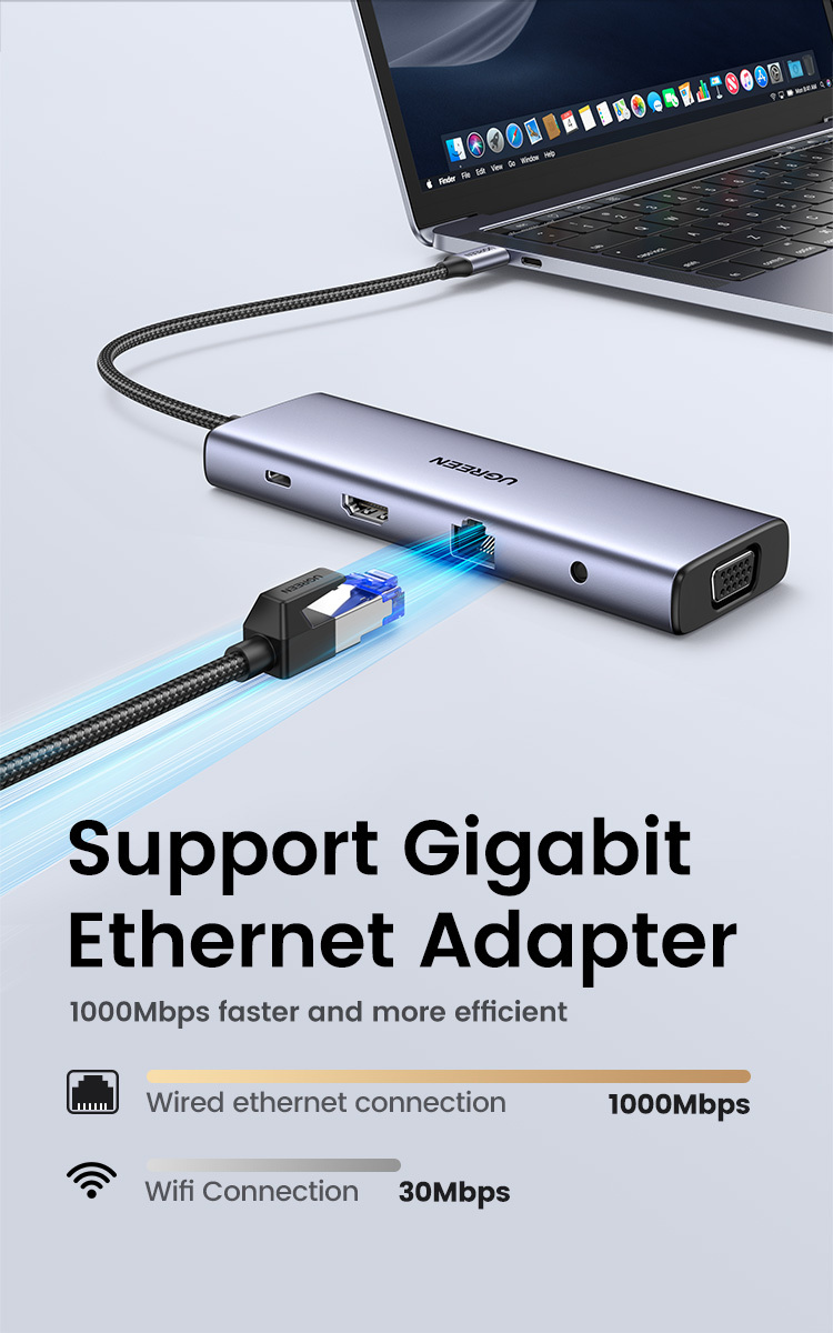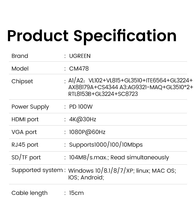 .HDMI x 1, VGA x 1, USB-C x 1, RJ45x 1, 3.5mm x 1, SD/TF Card x 1, USB 3.0 x 3