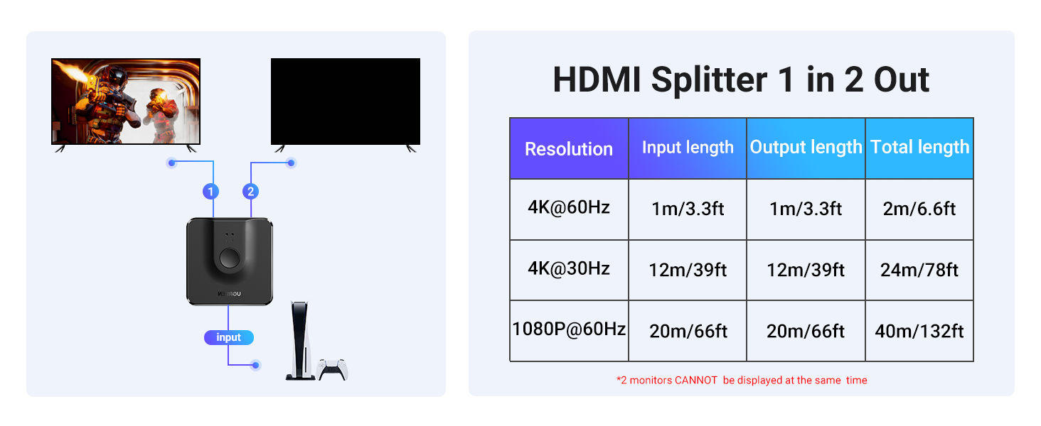 This switcher offers 2 HDMI inputs for your devices to connect with 1 HDMI Display monitor, with the single button, easy switch between the 2 devices, saves the trouble to plug and unplug; Bi-direction HDMI Switch also works the other way around as HDMI Splitter, offers the solution to connect 1 HDMI device with 2 external HDMI displays and choose between the displays, only 1 HDMI display will work in Splitter mode;