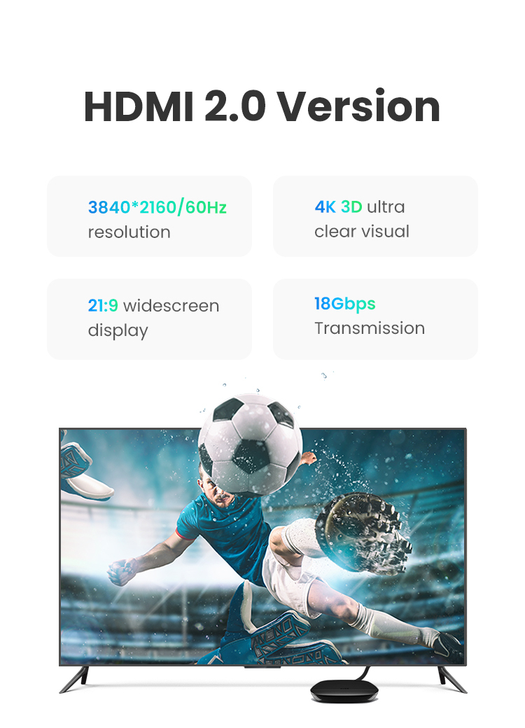 一款4K高清HDMI視頻連接線。HDMI線根據家用裝修等不同場景用途,設計不同長度款式,對應不同的HDMI版本協議;常用3米內短線款為HDMI2.0協議,支持4K高清3840*2160分辨率,3D立體成像,18Gbps傳輸頻寬,HDR動態分析,細節清清楚楚,還原真實場景;25米以上長線款設有專屬HDMI信號放大器,50米內穩定傳輸,工程裝修佈線更輕鬆